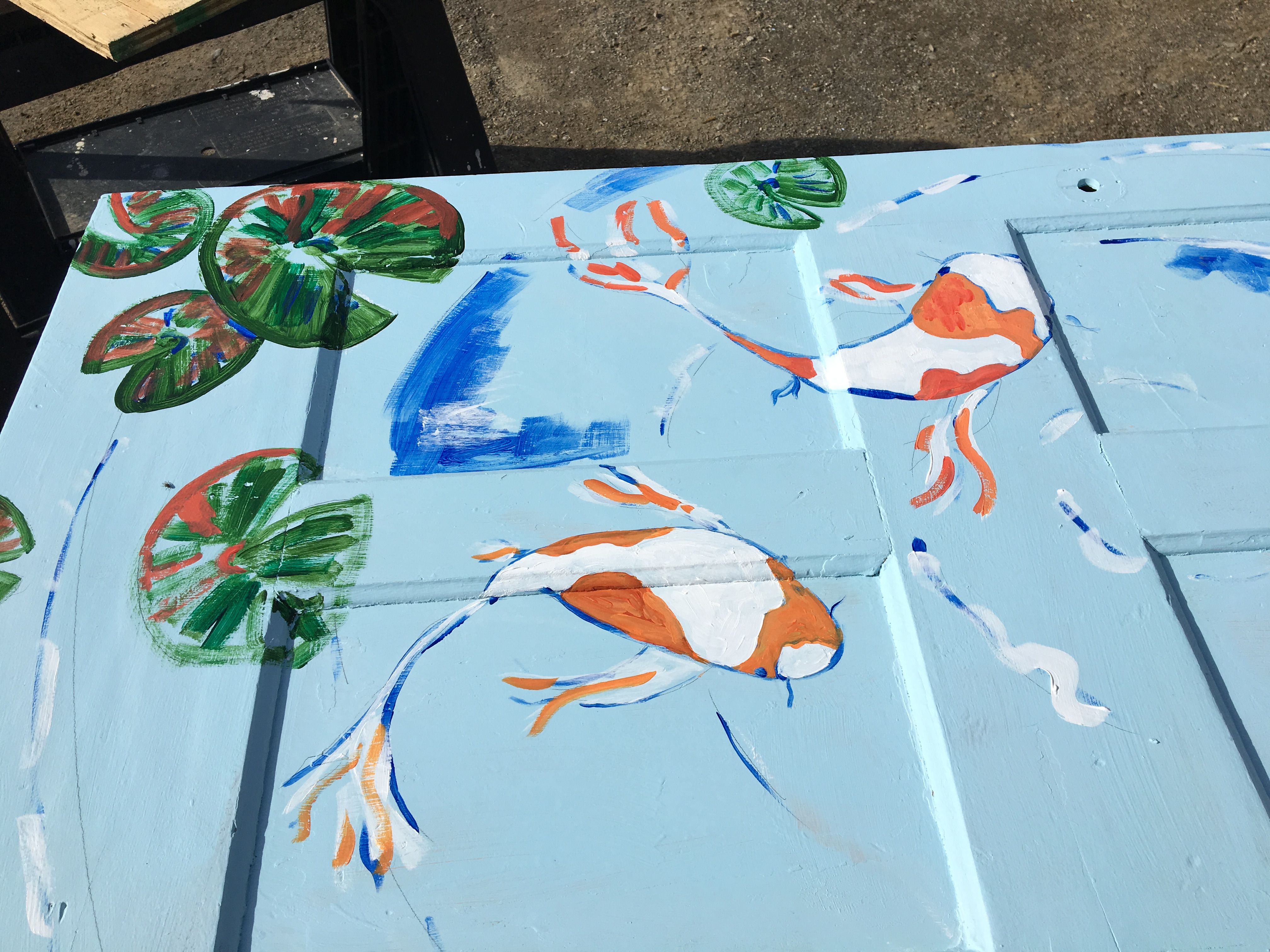 For some reason this project has begun an obsession with Koi for me and I’ve also created 2 pieces in kiln fired and glass enamel pieces featuring koi. This is the largest painting I’ve ever done, my back is a wreck from leaning over, but I’m having a great time with it!